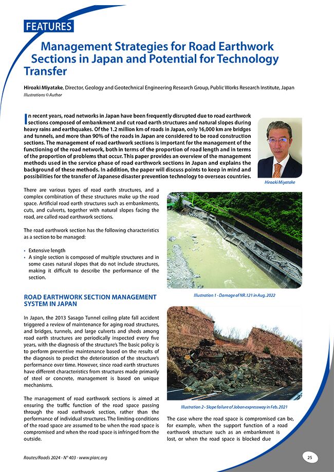 In recent years, road networks in Japan have been frequently disrupted due to road earthwork sections composed of embankment and cut road earth structures and natural slopes during heavy rains and earthquakes. Of the 1.2 million km of roads in Japan, only 16,000 km are bridges and tunnels, and more than 90% of the roads in Japan are considered to be road construction sections. The management of road earthwork sections is important for the management of the functioning of the road network, both in terms of the proportion of road length and in terms of the proportion of problems that occur. This paper provides an overview of the management methods used in the service phase of road earthwork sections in Japan and explains the background of these methods. In addition, the paper will discuss points to keep in mind and possibilities for the transfer of Japanese disaster prevention technology to overseas countries.