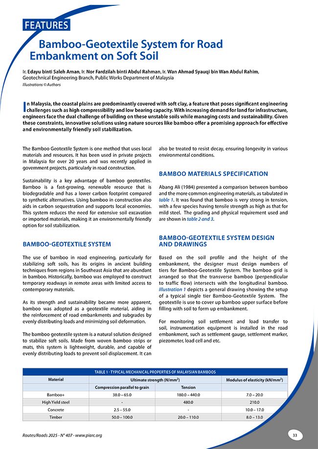 In Malaysia, the coastal plains are predominantly covered with soft clay, a feature that poses significant engineering challenges such as high compressibility and low bearing capacity. With increasing demand for land for infrastructure, engineers face the dual challenge of building on these unstable soils while managing costs and sustainability. Given these constraints, innovative solutions using nature sources like bamboo offer a promising approach for effective and environmentally friendly soil stabilization.