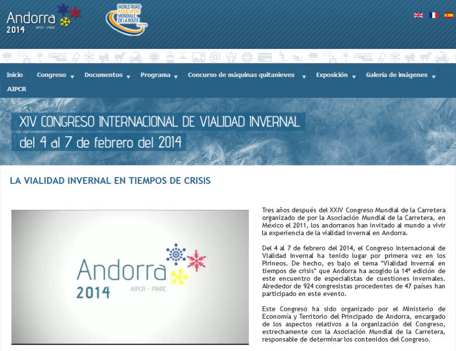 El XIVº Congreso Internacional de Vialidad Invernal se celebró en la capital de Andorra, Andorra la Vella, del 4 al 7 de febrero de 2014, sobre el tema "Conciliar la seguridad vial y el desarrollo sostenible con el cambio climático y la crisis económica".