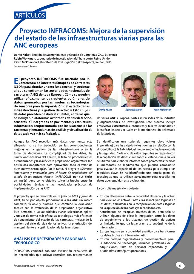 Proyecto INFRACOMS: Mejora de la supervisión del estado de las infraestructuras viarias para las ANC europeas