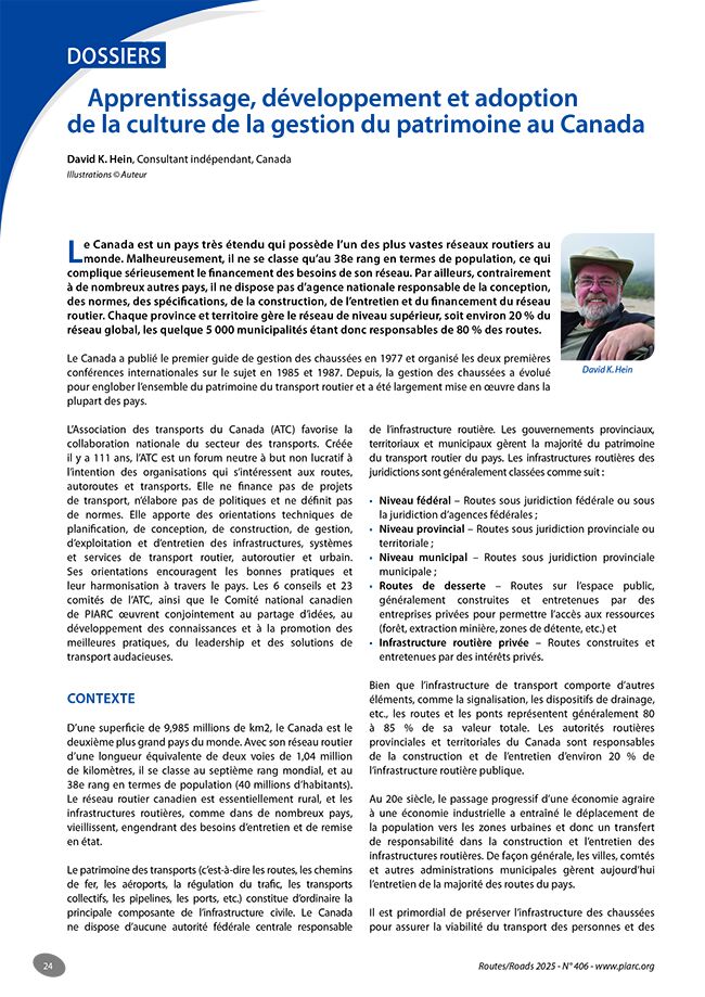 Le Canada est un pays très étendu qui possède l’un des plus vastes réseaux routiers au monde. Malheureusement, il ne se classe qu’au 38e rang en termes de population, ce qui complique sérieusement le financement des besoins de son réseau. Par ailleurs, contrairement à de nombreux autres pays, il ne dispose pas d’agence nationale responsable de la conception, des normes, des spécifications, de la construction, de l’entretien et du financement du réseau routier. Chaque province et territoire gère le réseau de niveau supérieur, soit environ 20 % du réseau global, les quelque 5 000 municipalités étant donc responsables de 80 % des routes.