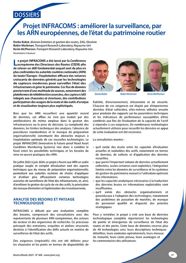 Le projet INFRACOMS a été lancé par la Conférence européenne des Directeurs des Routes (CEDR) afin de relever un défi fondamental auquel sont de plus en plus confrontées les autorités routières nationales (ARN) de toute l’Europe : l’exploitation efficace des volumes croissants de données générés par les technologies de capteurs modernes pour surveiller l’état des infrastructures et gérer le patrimoine. Ces flux de données proviennent d’une multitude de sources, notamment des plateformes de télédétection avancées, des capteurs IdO intégrés aux chaussées et structures, des contributions participatives des usagers de la route et des outils d’analyse et de visualisation toujours plus sophistiqués.