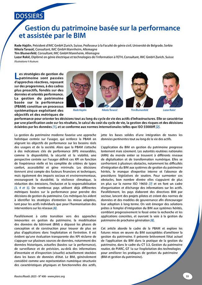 Les stratégies de gestion du patrimoine sont passées d’approches réactives, reposant sur des programmes, à des cadres plus proactifs, fondés sur des données et orientés performance. La gestion du patrimoine basée sur la performance (PBAM) constitue un processus systématique exploitant des objectifs et des métriques de performance pour orienter les décisions tout au long du cycle de vie des actifs d’infrastructures. Elle se caractérise par une planification axée sur les résultats, le calcul du coût du cycle de vie, la gestion des risques et des décisions éclairées par les données, et se conforme aux normes internationales telles que ISO 55000ff.