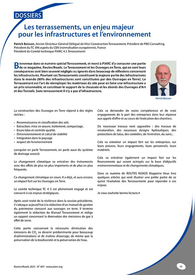 Bienvenue dans ce numéro spécial Terrassement, et merci à PIARC d’y consacrer une partie de ce magazine, Routes/Roads. Le Terrassement et les Ouvrages en Terre, qui en sont leurs conséquences sont bien souvent négligés ou ignorés dans beaucoup de réflexions concernant les infrastructures. Pourtant ces Terrassements constituent la majeure partie des infrastructures dans le monde (80% des infrastructures sont constituées par des Ouvrages en Terre). Le Terrassement est l’art de réemployer les matériaux du site pour en faire une infrastructure a un prix raisonnable, et constituer le support de la chaussée et les abords des Ouvrages d’Art et des Tunnels. Sans terrassement il n’y a pas d’infrastructure.