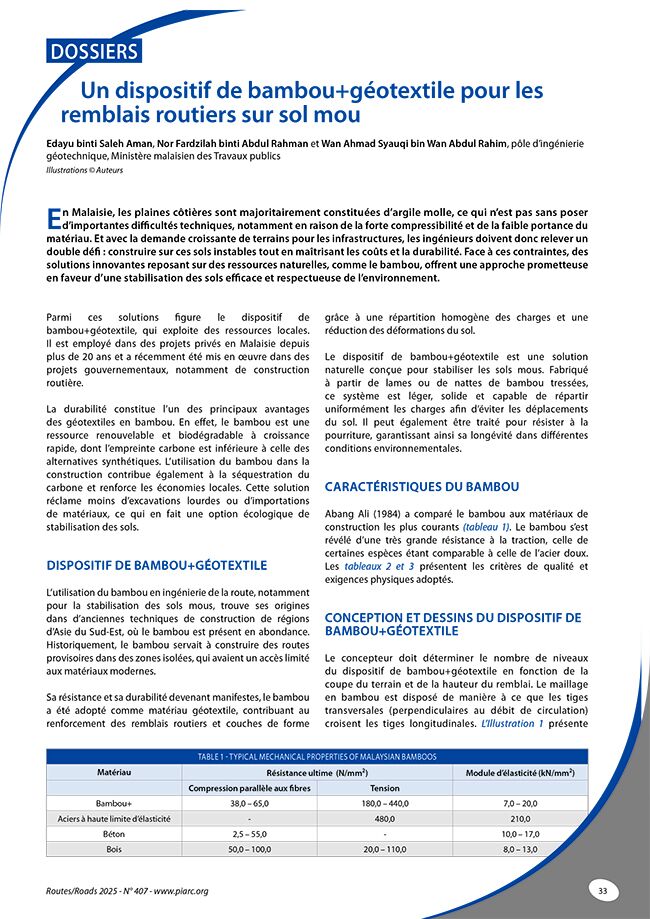 En Malaisie, les plaines côtières sont majoritairement constituées d’argile molle, ce qui n’est pas sans poser d’importantes difficultés techniques, notamment en raison de la forte compressibilité et de la faible portance du matériau. Et avec la demande croissante de terrains pour les infrastructures, les ingénieurs doivent donc relever un double défi : construire sur ces sols instables tout en maîtrisant les coûts et la durabilité. Face à ces contraintes, des solutions innovantes reposant sur des ressources naturelles, comme le bambou, offrent une approche prometteuse en faveur d’une stabilisation des sols efficace et respectueuse de l’environnement.